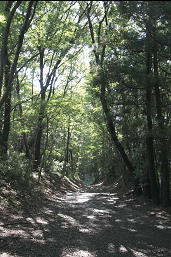 H絹の道 資料館を少し行くと、道が二股に分かれ、右の道は山奥へと続いている。これが絹の道だ。まずそちらに向かってみる。木々に囲まれ薄暗い急坂を登っていく。やがて砂利道となった。この先は大塚公園へと続いているが、大きな石がごろごろしていて凹凸が激しく、おまけに雨の後ということもあって、クロスバイクでは、あまりに走りにくいので、途中で引き返した。 |