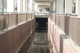 H田中橋 暗渠の上は、駐輪場になっていた。しばらくいくと、橋の欄干だけが残っていた。かつての谷沢川の上にかかっていたんだろう。 |