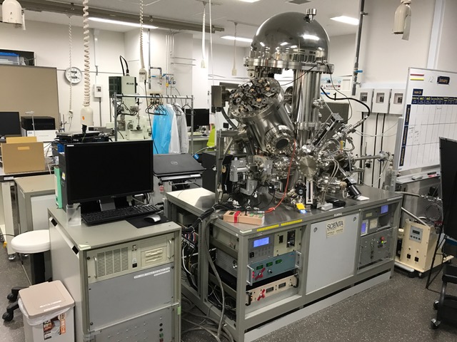 分子線エピタキシー法(MBE)で作製した薄膜試料を、光電子分光(XPS)や走査トンネル顕微鏡(STM)を用いて化学状態と表面構造の解析を行います。XPS、MBE、STMが超高真空環境で接続されており、作製した試料を大気暴露することなく分析することが可能です。